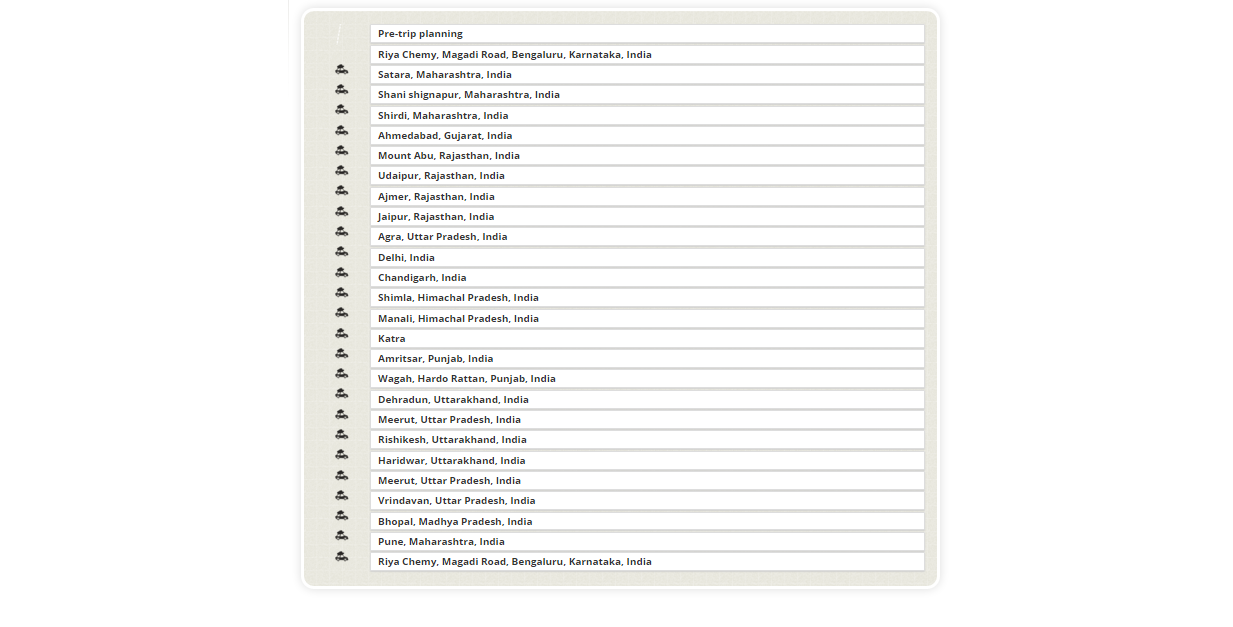 Team Zessta - Explore India by Road 8000km journey 30 days Vehicle: Tata Safari View Full Size Travel Map at Travellerspoint Download Now Place of Interest Route Map Trip Plan Vehicle Check & things to be carried